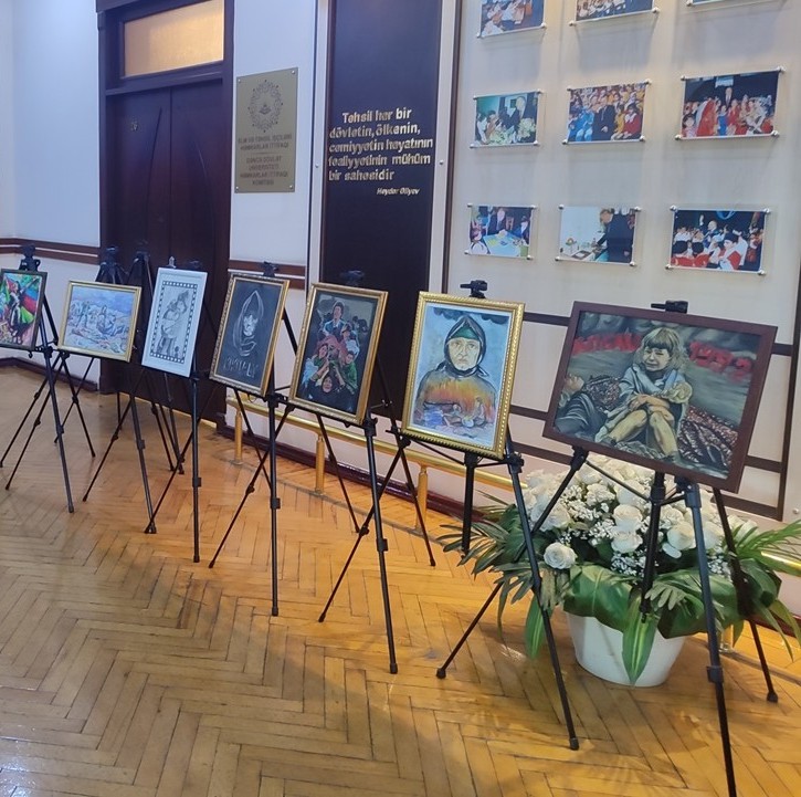 Gəncə Dövlət Universitetində Xocalı faciəsinin 34-cü ildönümünə həsr edilmiş anım tədbirindən öncə rektor Yusif Yusibov və professor-müəllim heyəti rəsm əsərlərinə və  kitablardan ibarət  guşəyə baxış keçiriblər.