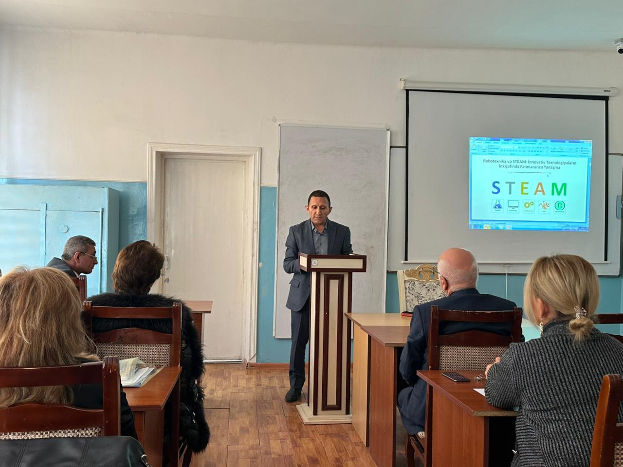 Elçin Cavadov çıxış edərək təqdim olunan mövzunun aktuallığından, eləcə də STEAM təhsilinin əhəmiyyətindən danışdı və qeyd etdi ki, GDU-da STEAM laboratoriyası da fəaliyyət göstərir, bu laboratoriya müasir avadanlıqlarla təchiz olunmuşdur. Daha sonra qeyd etdi ki, fənlərarası yanaşmanın əsas üstünlüyü – şagird və tələbələrin yalnız nəzəri biliklərə deyil, praktiki və yaradıcı bacarıqlara da yiyələnməsini təmin etməsidir. Robototexnika bu baxımdan ideal bir vasitə olaraq çıxış edir. O, riyaziyyat və fizika kimi dəqiq elmlərlə yanaşı, texnologiya və dizayn sahələrini də bir araya gətirərək tələbələrdə real problemlərin həllində kompleks düşünmə imkanı yaradır.
