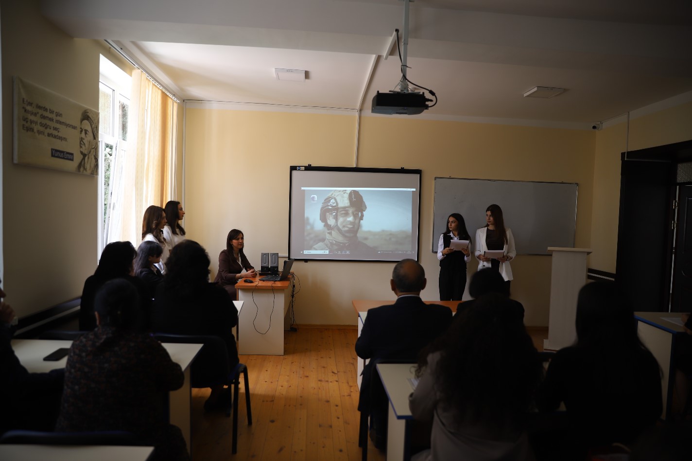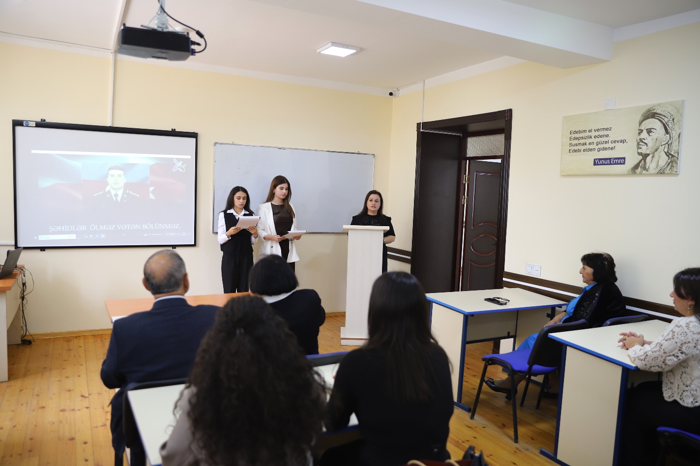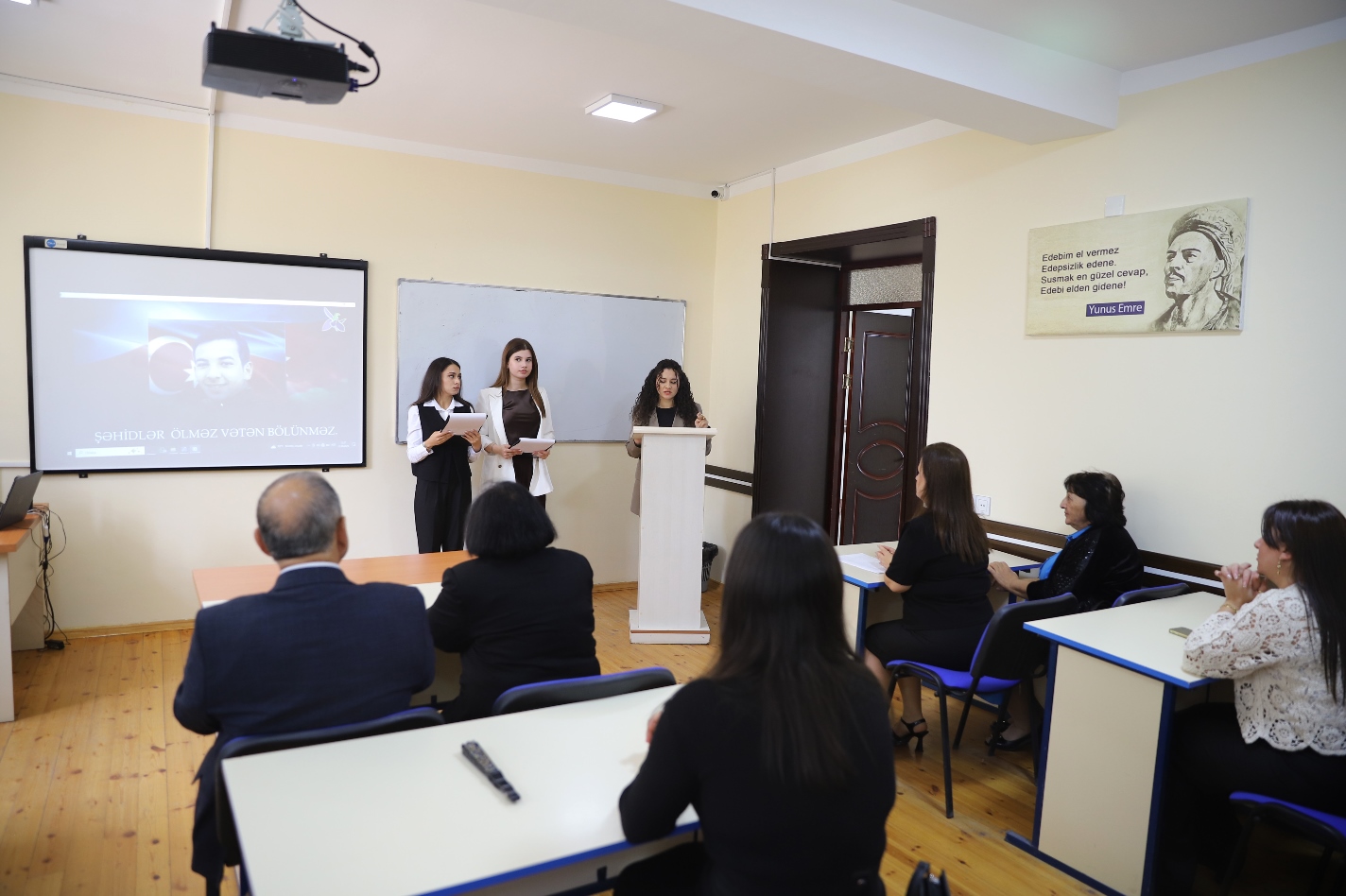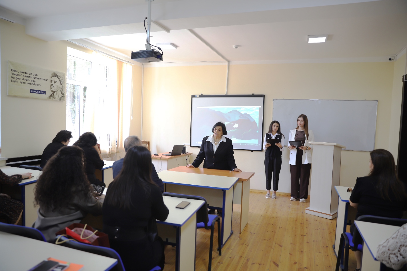 Humanitar məsələlər üzrə prorektor Gülsüm Fətəliyeva tədbiri açaraq bildirdi ki, 44 günlük Vətən müharibəsində Müzəffər Ali Baş Komandan İlham Əliyevin rəhbərliyi ilə ordumuz bütün döyüş əməliyyatları yüksək səviyyədə həyata keçirməklə mənfur düşməni diz çökdürdü. Şanlı Zəfər qazanıldı və ölkəmizin ərazi bütövlüyü bərpa edildi. Prorektor onu da vurğuladı ki, Şanlı Zəfərimiz sayəsində bu gün Azərbaycanın Dövlət Bayrağı suverenliyimizin bərqərar olduğu bütün ərazilərimizdə əzəmətlə dalğalanır. İşğal dövründə viran qoyulmuş torpaqlarımıza yeni həyat gəlir. Məcburi köçkünlərin doğma yurdlarına qaytarılmasına yönələn nəhəng layihələr həyata keçirilir.